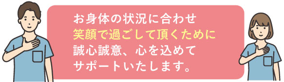 利用者様の主治医・ケアマネージャー・ヘルパー・ご家族の皆様と常に連携を取りながら、利用者様の身体機能の改善と向上に貢献致します。