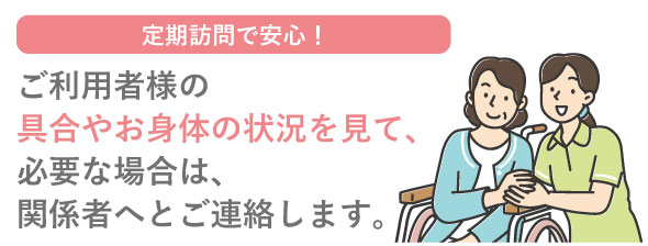 定期訪問を行う事によりお独り住まいの方の安否確認の役割を担わせて頂きます。連絡に応答がなかったり、緊急の場合は速やかにケアマネージャー様やご家族様へと連絡させていただきます。