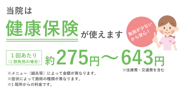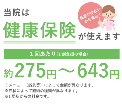 あんしん福寿治療院は健康保険が使えるため、施術料と往診料(先生がお伺いさせて頂くための交通費)を合わせてもご利用者様の負担は、275円〜643円程(※1割負担の場合 ※1局所からの料金)です。