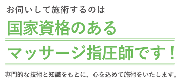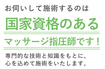 カウンセリング時に詳しくお話をお聞きし、お身体の状態、日常生活でのご希望などを正確に把握した上で、国家資格である「あん摩マッサージ指圧師」がご利用者様の日々の変化に合わせながら、知識と技術を尽くして施術を行わせていただきます。そのため、少ないご負担で、専門家による安心のマッサージ治療をご自宅で受けられます。